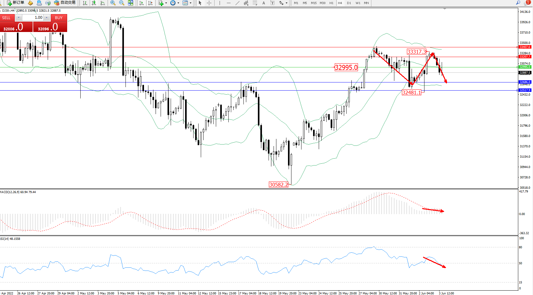 交易策略:32995下方看跌,目标32686、32517