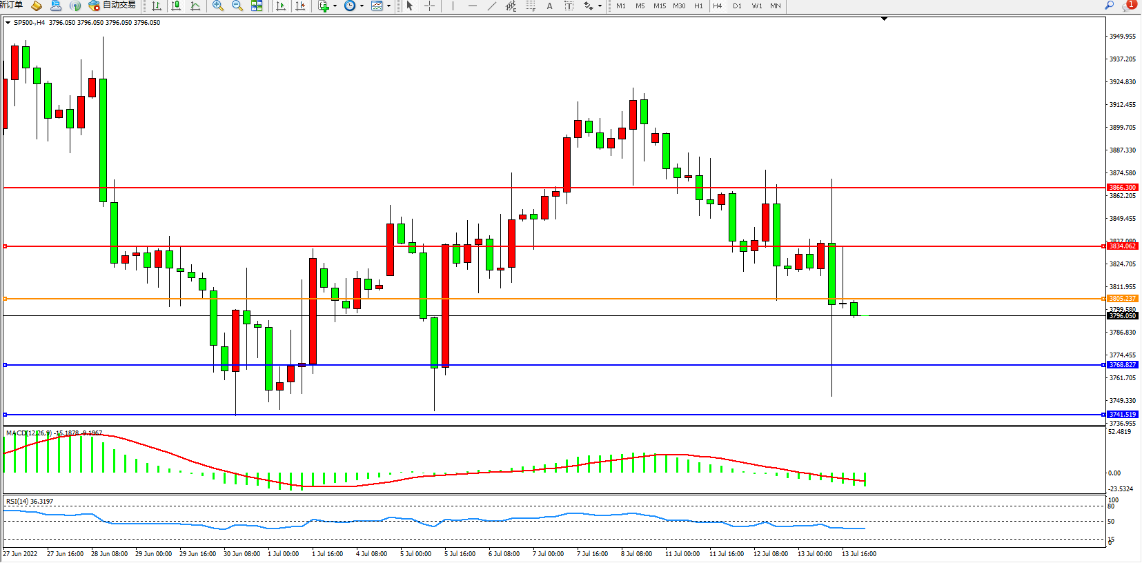 标普500指数7月13日(周三)收盘下跌18.65点,跌幅0.49%,报3800.15点;美国劳工统计局报告称,美国经济放缓的同时,通货膨胀继续起到抑制作用,6月份各类商品的价格大幅上涨。