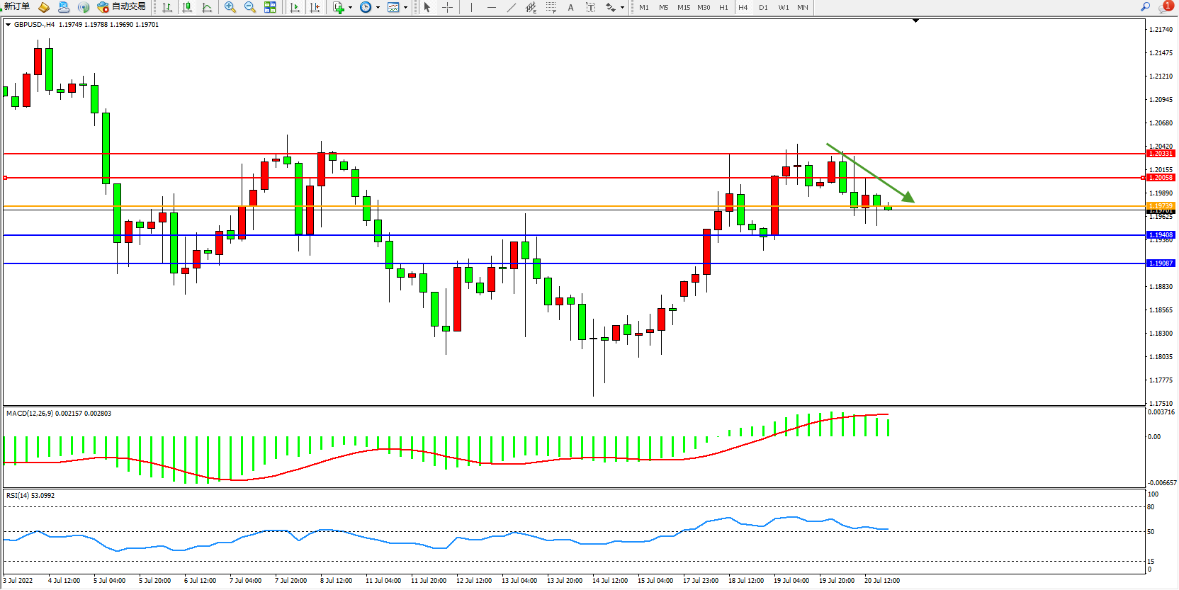 交易策略:1.19739下方看跌,目标1.19408、1.19087