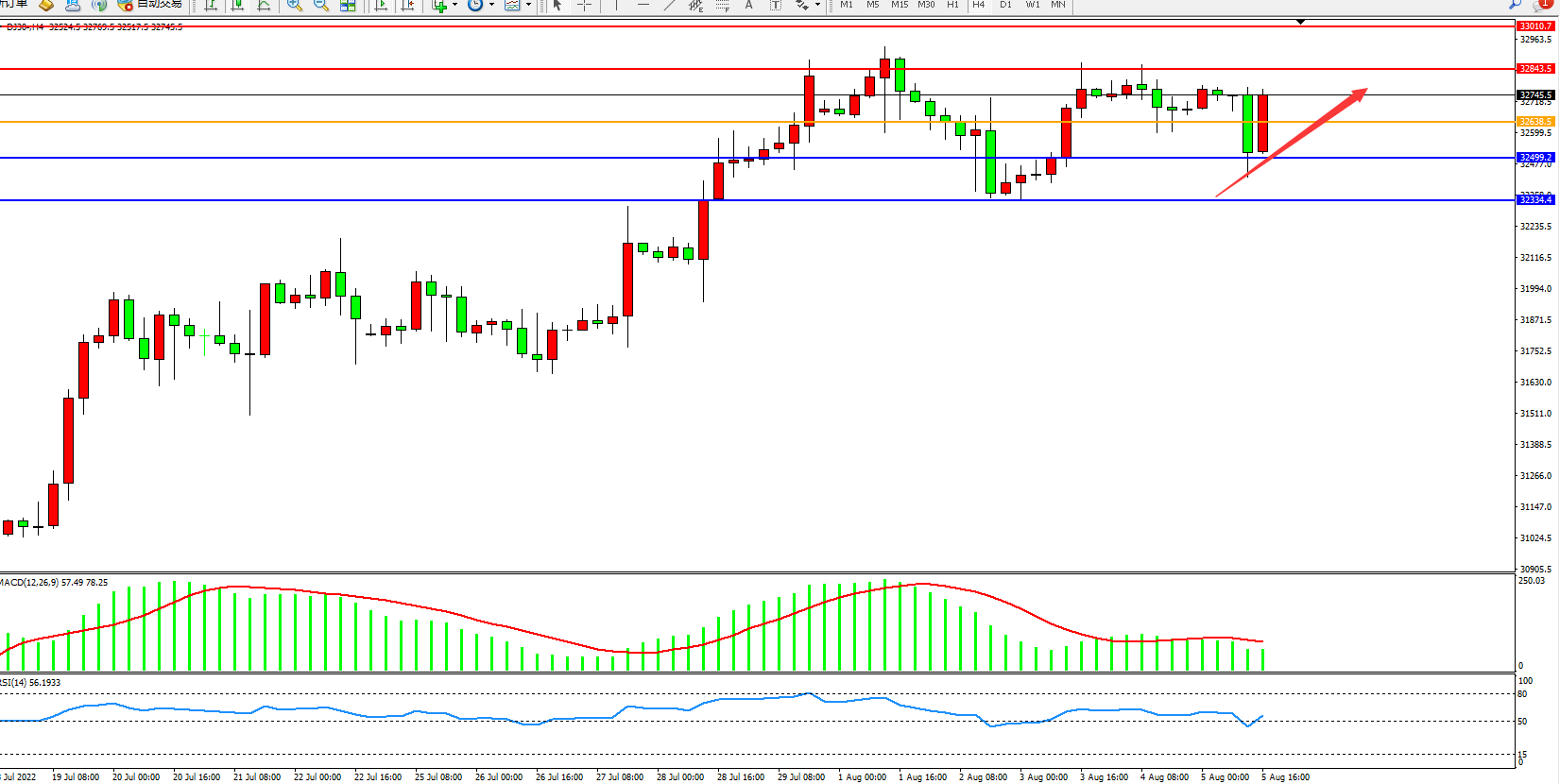 道琼斯指数8月5日(周五)收盘上涨74.69点,涨幅0.23%,报32801.51点;美国7月非农就业增长远超预期,且失业率小幅下降,为美联储提供了足够的缓冲来维持其激进的加息路线,以达到其抑制通胀的目标。