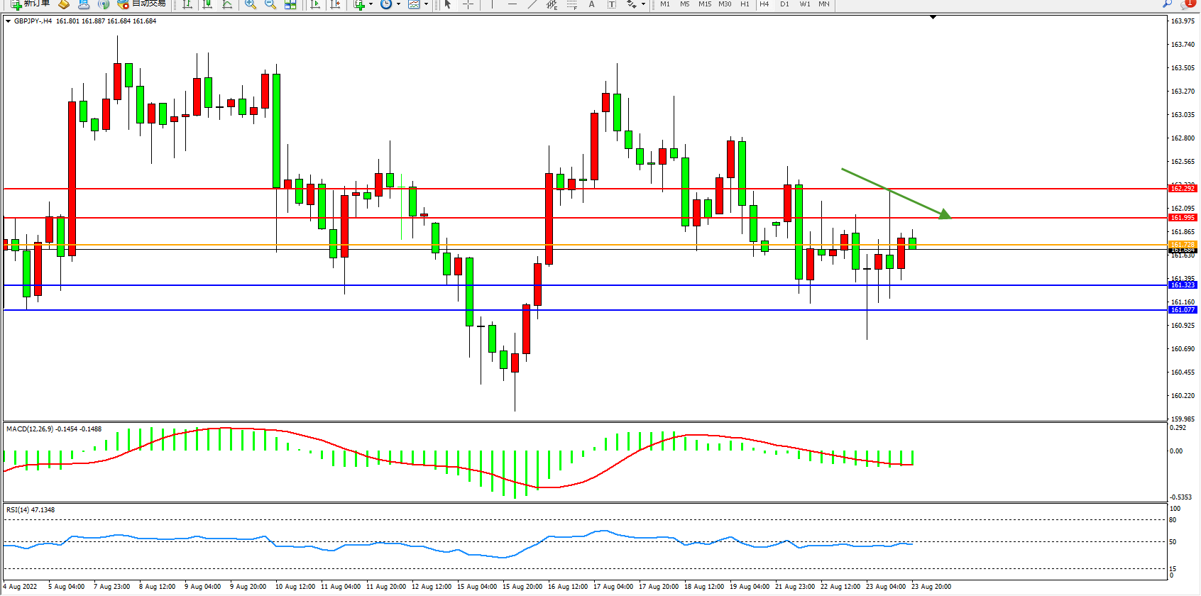 交易策略:161.728下方看跌,目标161.323、161.077