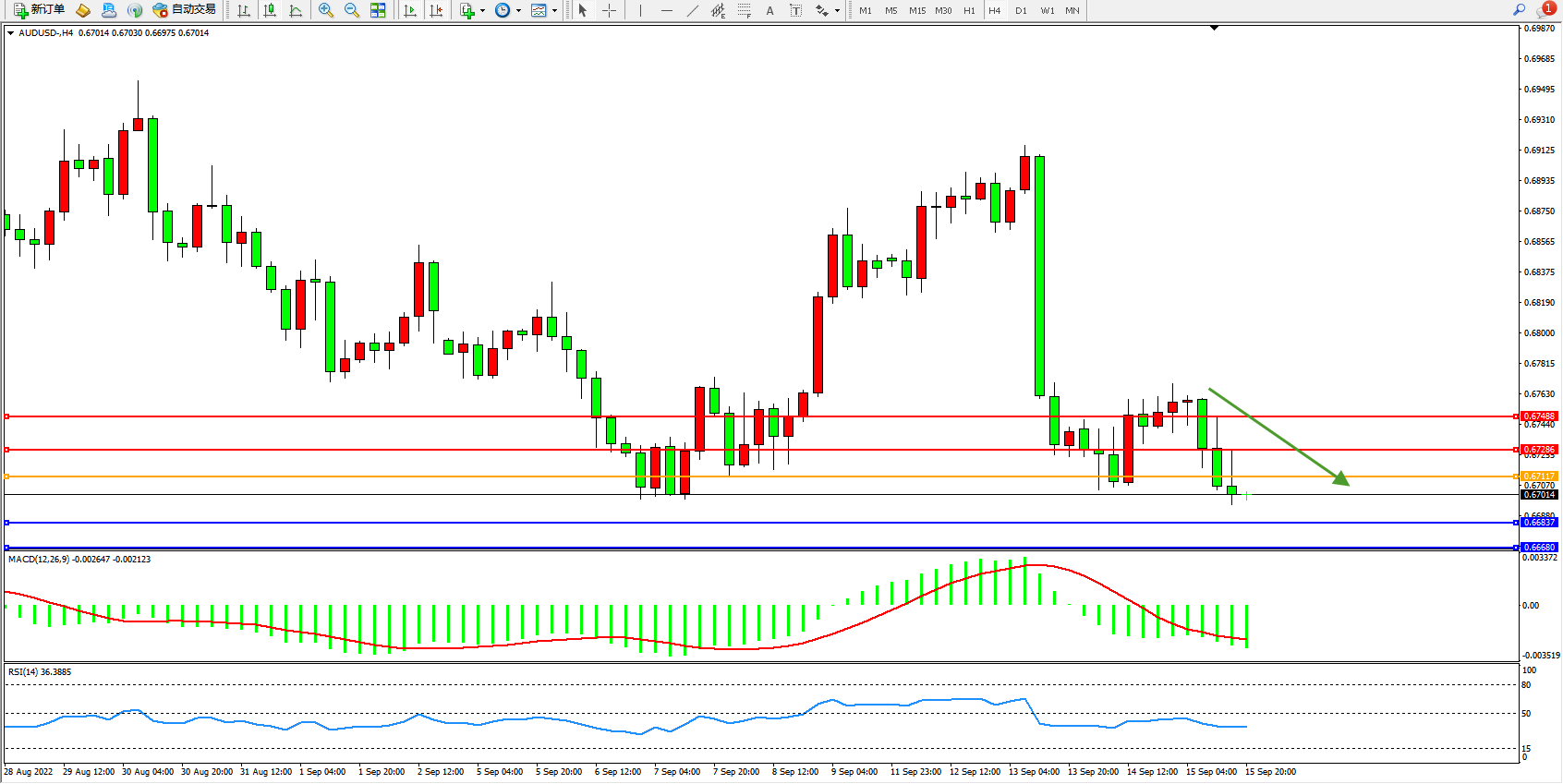 澳元美元AUDUSD——4小时K线图显示: