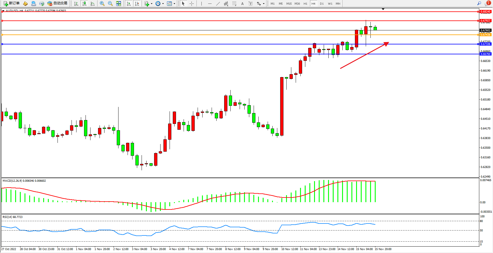 交易策略:0.67438上方看涨,目标0.67927、0.68240