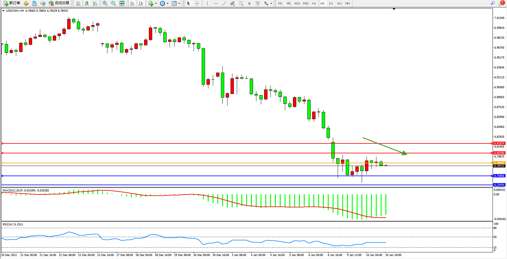交易策略:6.78860下方看跌,目标6.76866、6.75454