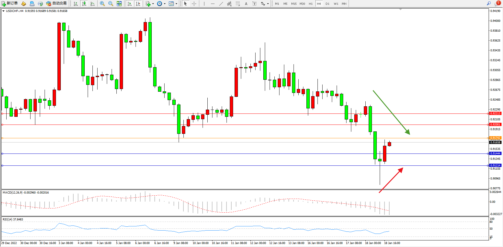 美元瑞郎USDCHF——4小时K线图显示: