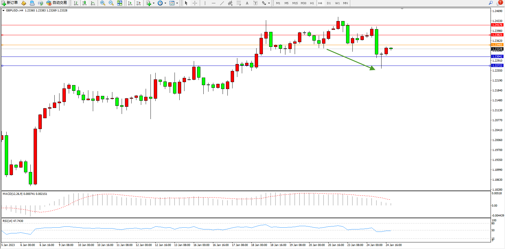 交易策略:1.23465下方看跌,目标1.23042、1.22722