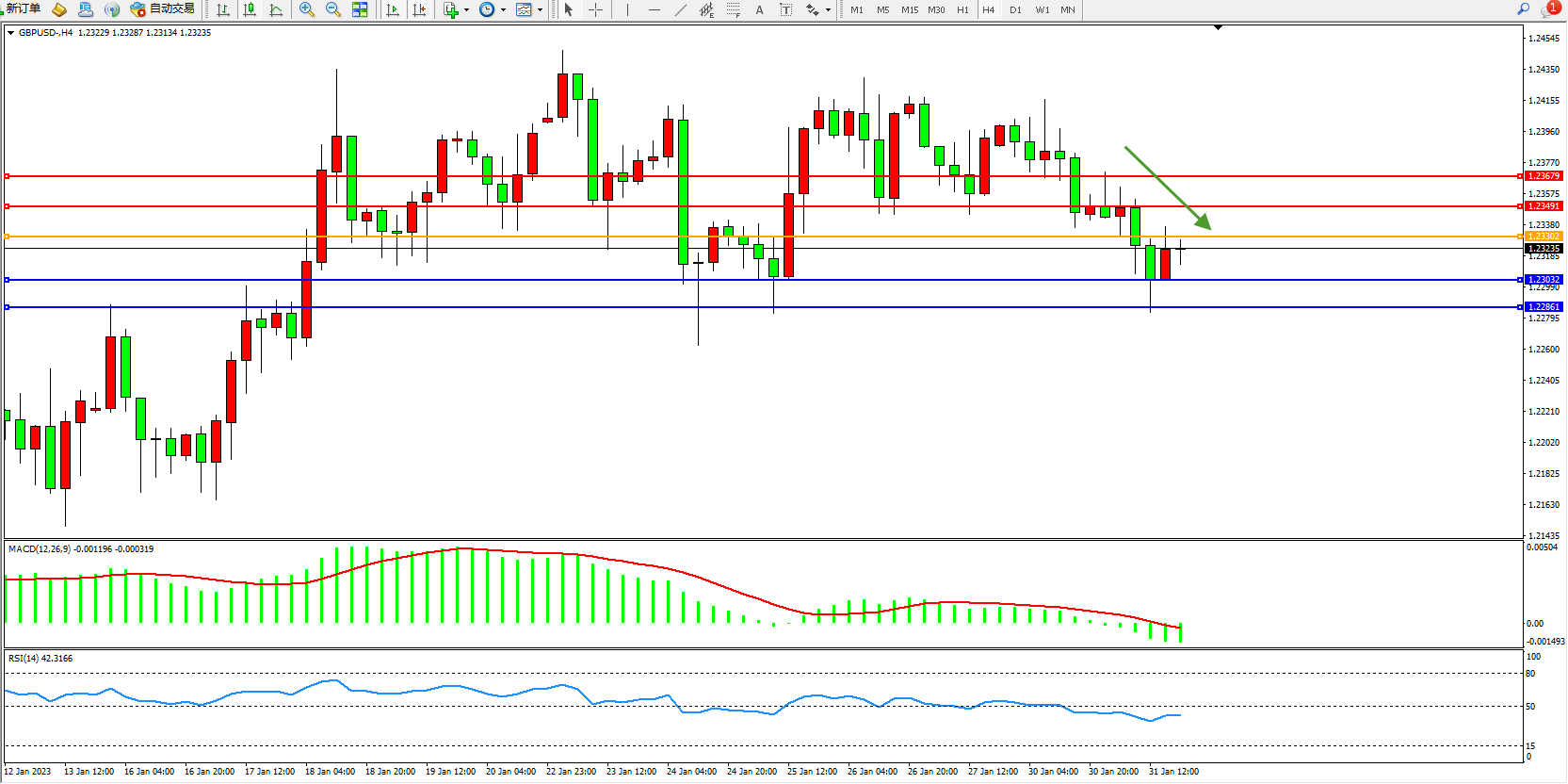 交易策略:1.23302下方看跌,目标1.23032、1.22861