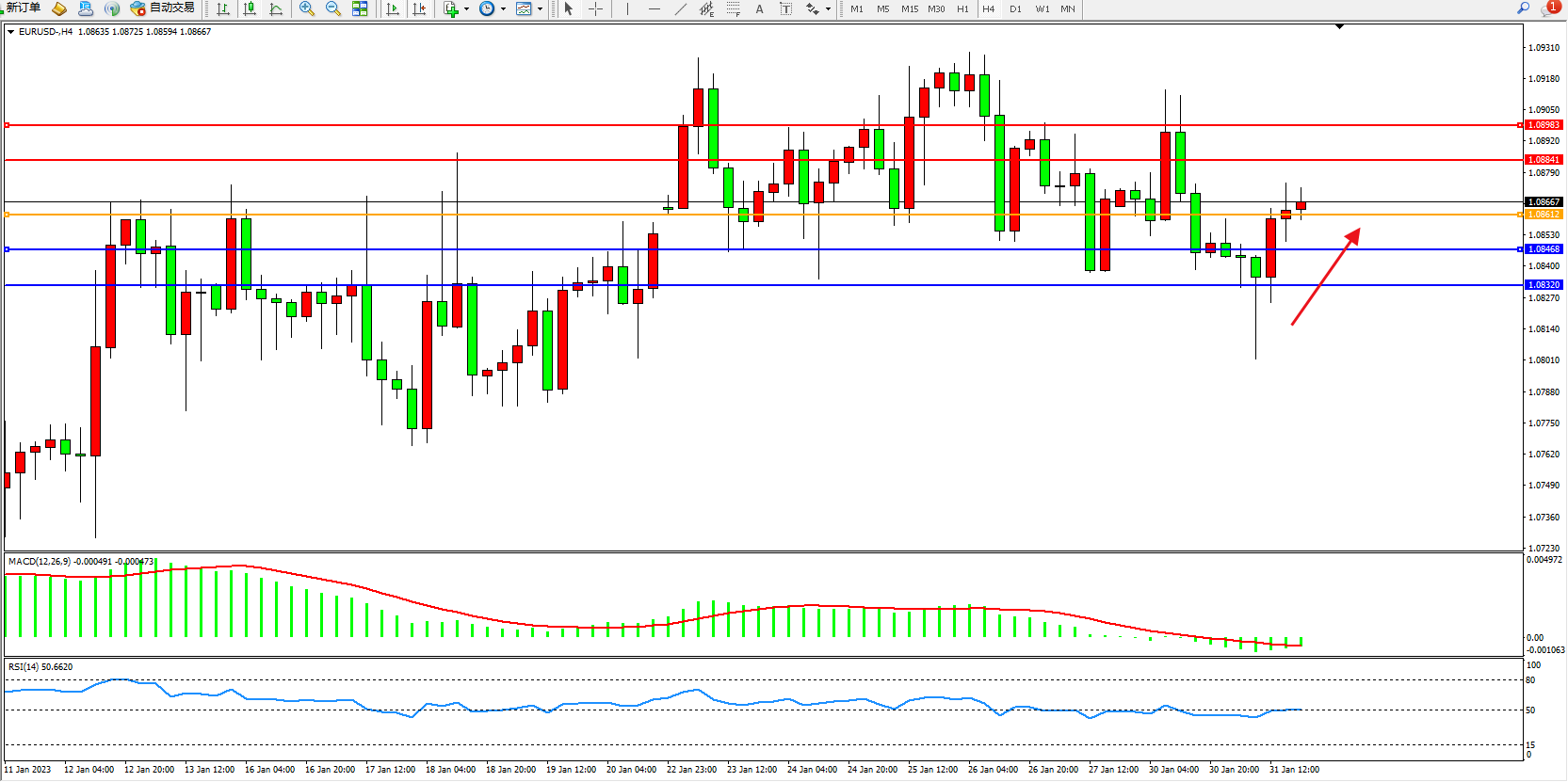 欧元美元EURUSD—4小时K线图显示: