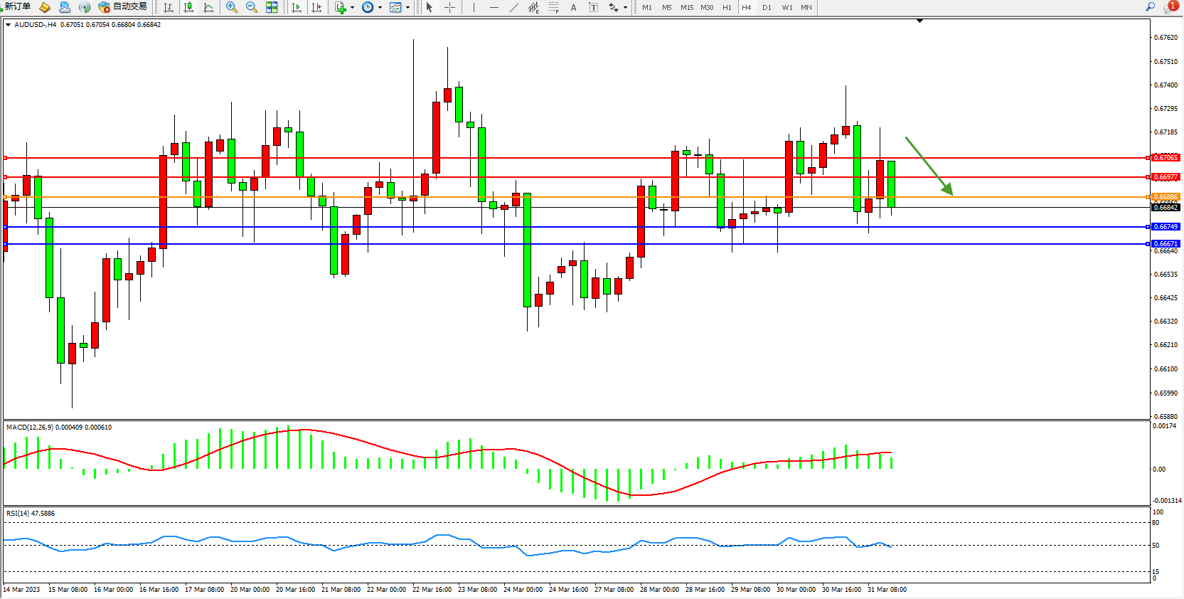 交易策略:0.66886下方看跌,目标0.66749  0.66671