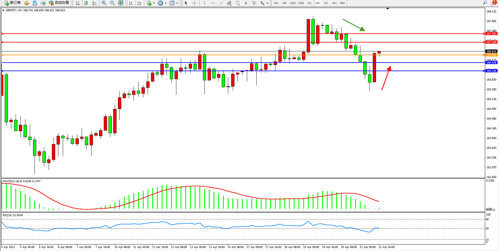 交易策略:166.681上方看涨,目标167.100  167.383
