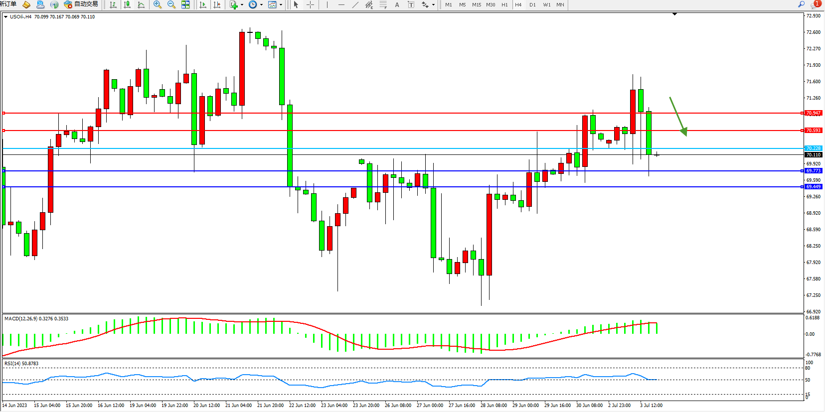 原油维持70.110附近震荡,全球最大的石油出口国沙特阿拉伯将减产期限延长至8月份,掩盖了对全球经济放缓和美联储可能进一步加息的担忧。