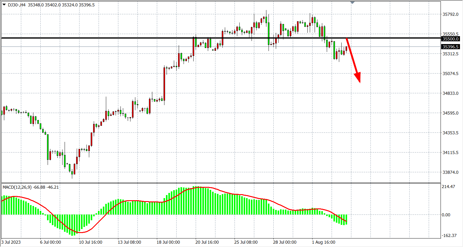 4小时图看,道指在35400附近盘整,延续在35330附近受支撑,MACD量能在零轴上缩量,行情维持高位盘整,支撑关注35200-35000附近,阻力35500-35800。