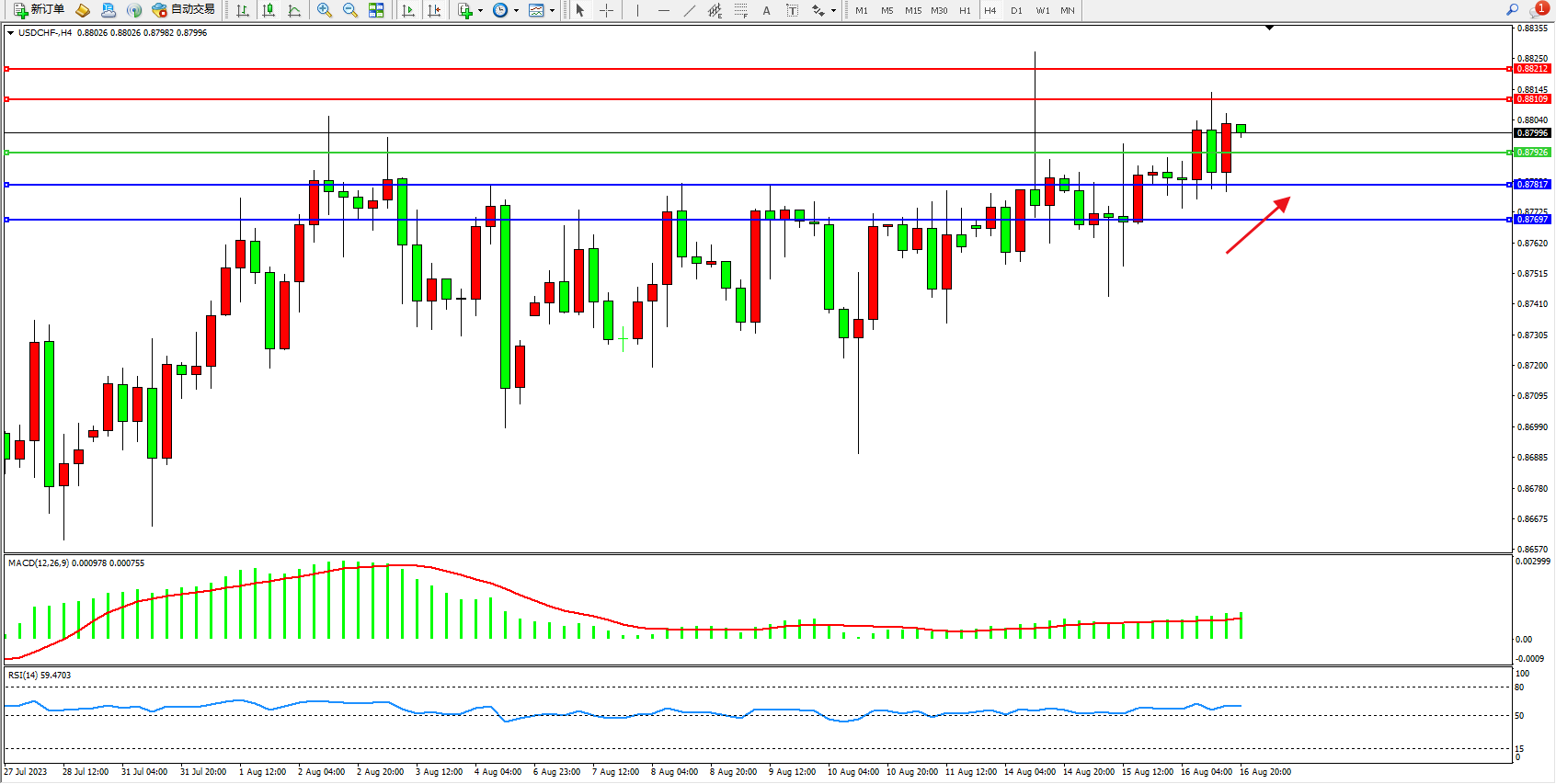 美元瑞郎USDCHF——4小时K线图显示: