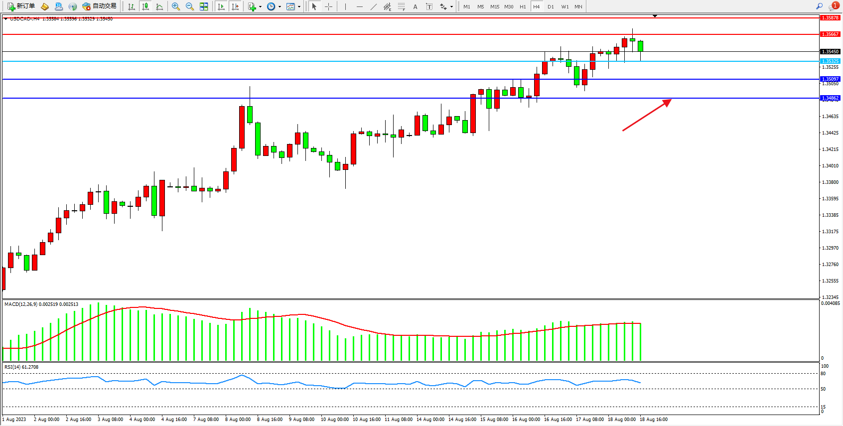 4小时图看:多头动力高位整理上移,市场看涨情绪依旧,短期有继续向上移动迹象,,MACD指标处于多头区域高位整理,RSI指标处于多头区域震荡;