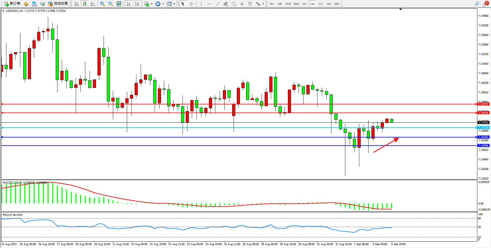 美元人民币USDCNH——4小时K线图显示:
