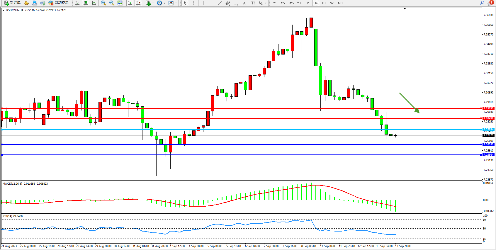 交易策略:7.27594下方看跌,目标7.26390  7.25564