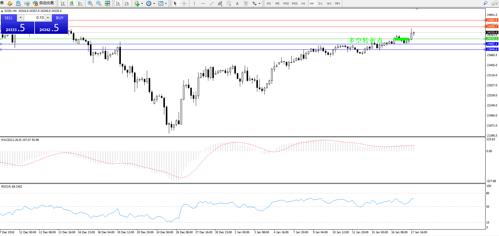道琼斯指数DJ30—— 4小时K线图显示: