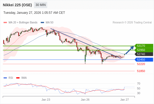在 52450 之上,看涨,目标价位为 52950 ,然后为 53170 。