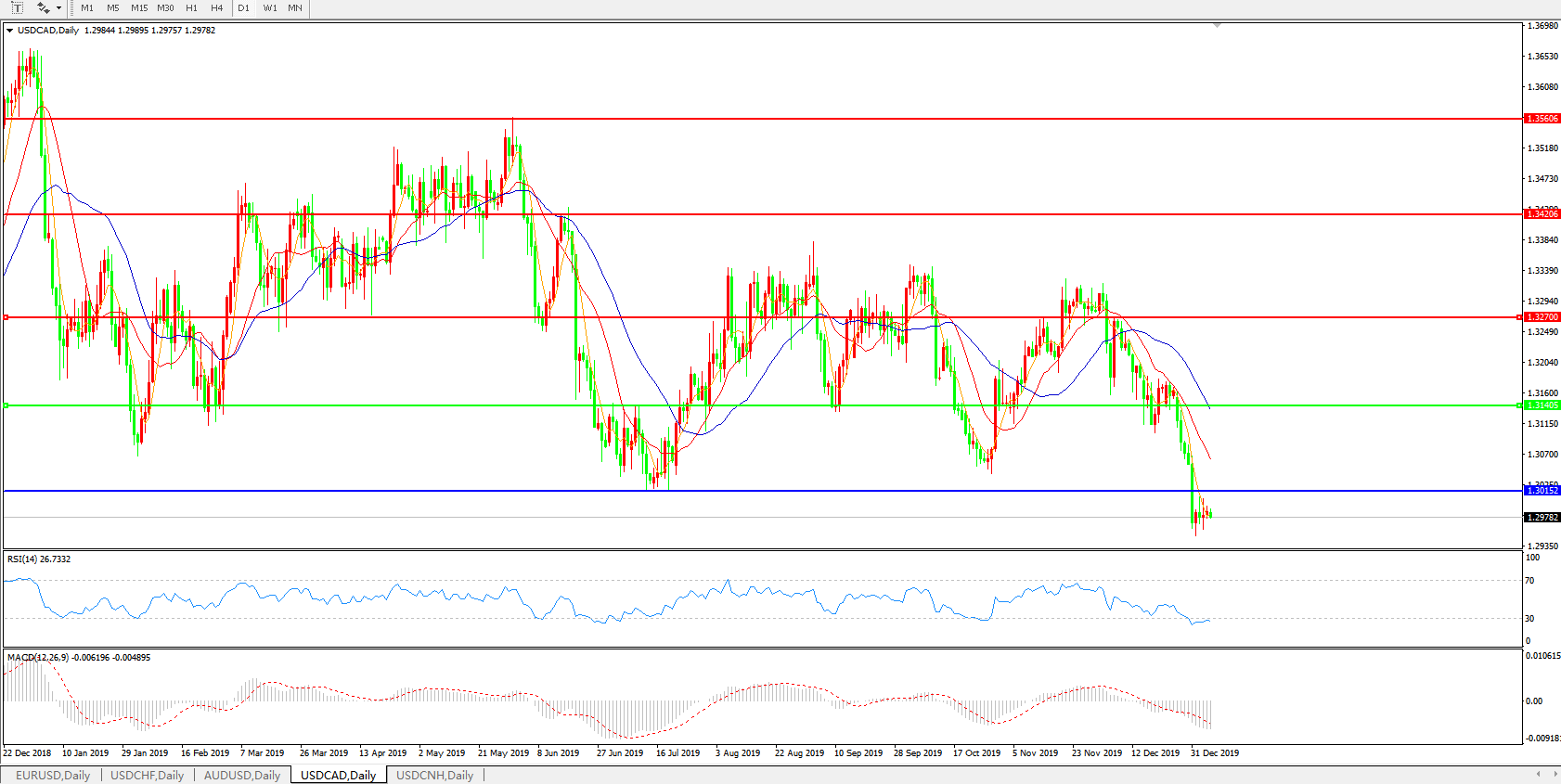 技术面简析:日线图均线呈空头排列,汇价近日持续窄幅整理,整体依旧较为弱势,MACD持续下行且量能0轴下方再度加速放量,RSI震荡走低,预计汇价大概率将进一步下行。