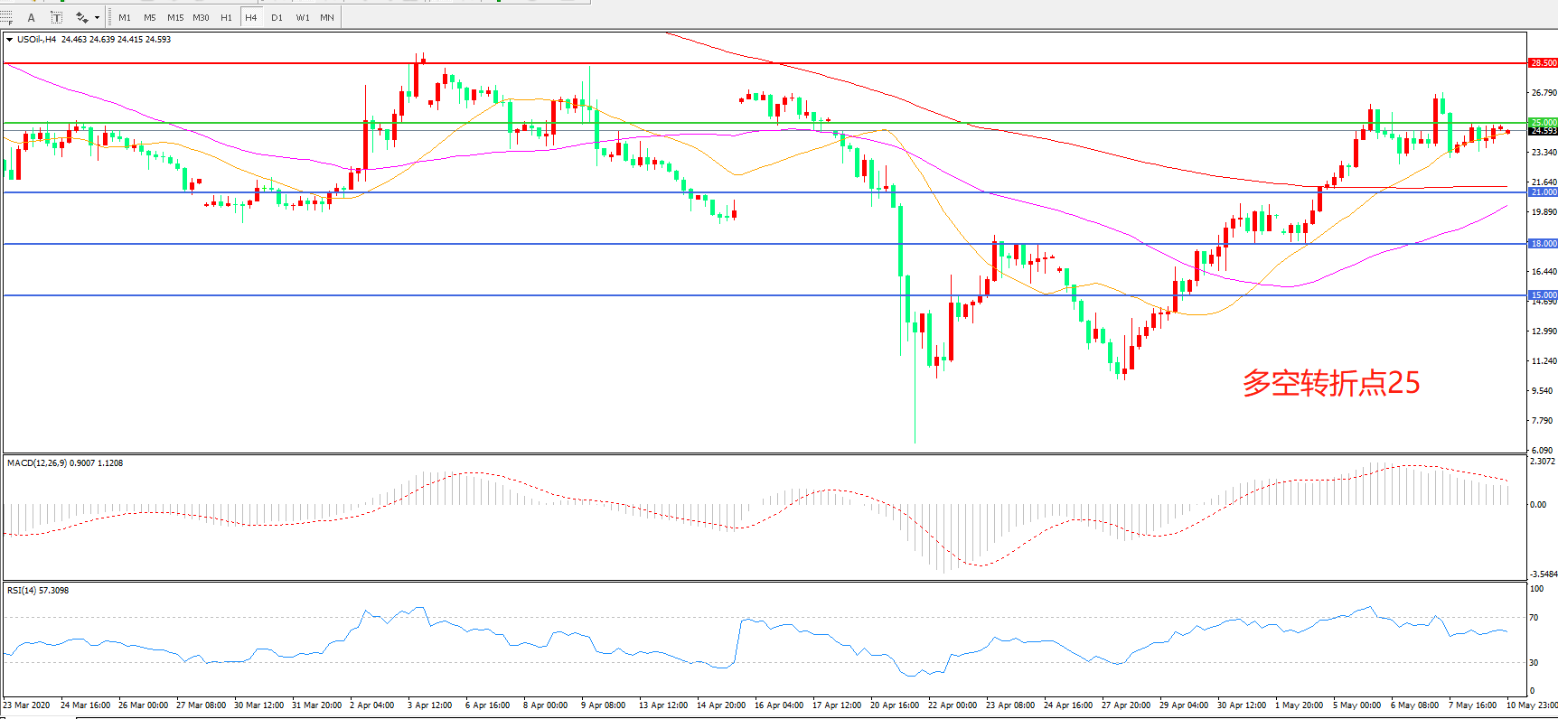4小时图看,油价延续高位震荡,整体走势有所回暖,25美元成为短期阻力,均线系统拐头向上,MACD红柱缩短,RSI指标走平,日内延续上行概率较大。