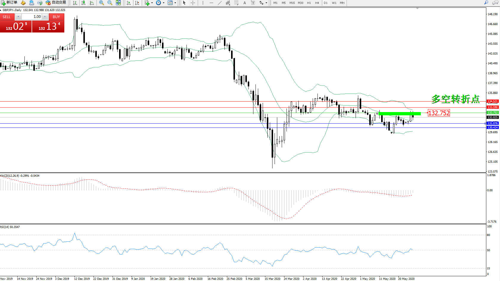 交易策略:132.752下方看跌,目标131.076、130.424