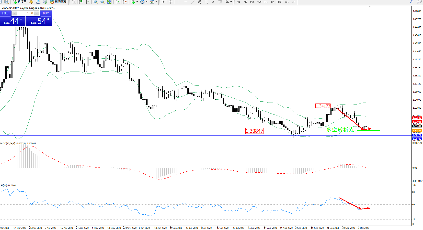 美元加元USDCAD——日K线图显示: