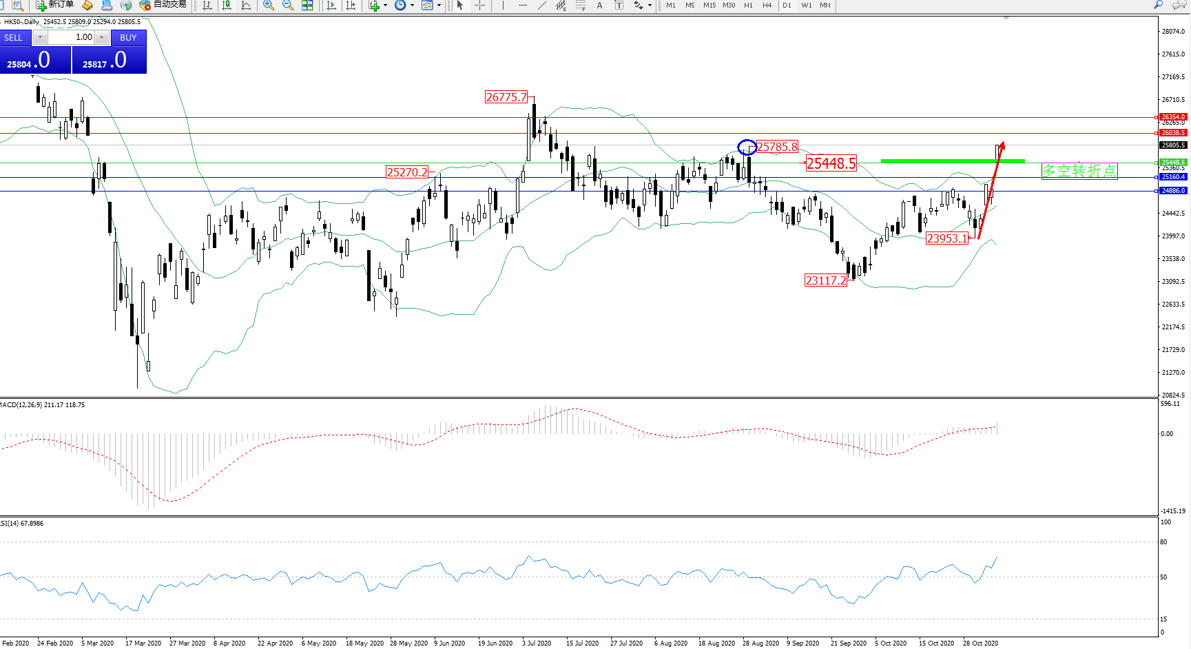 交易策略:25448上方看涨,目标26038、26354