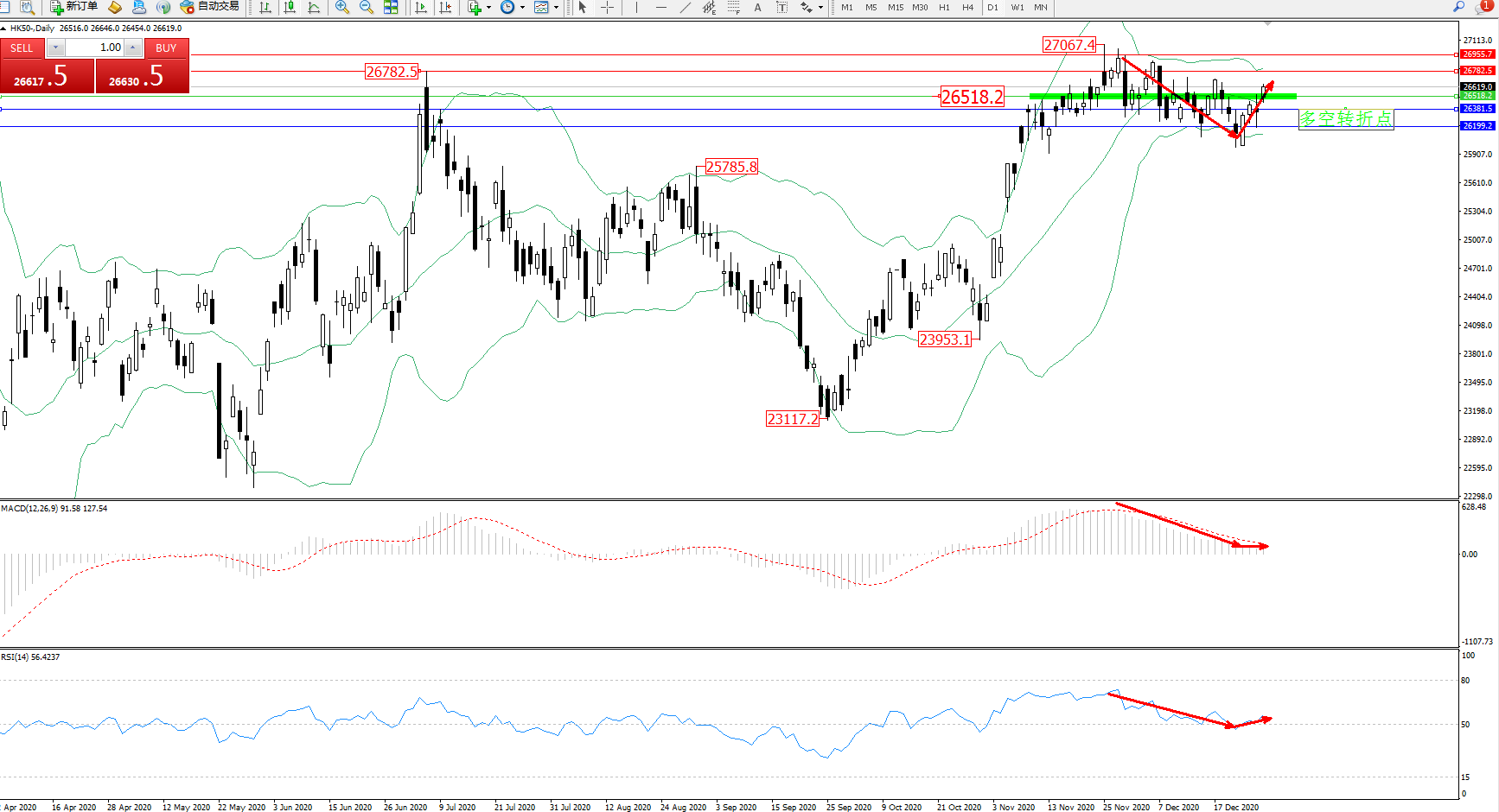 交易策略:26518上方看涨,目标26782、26955