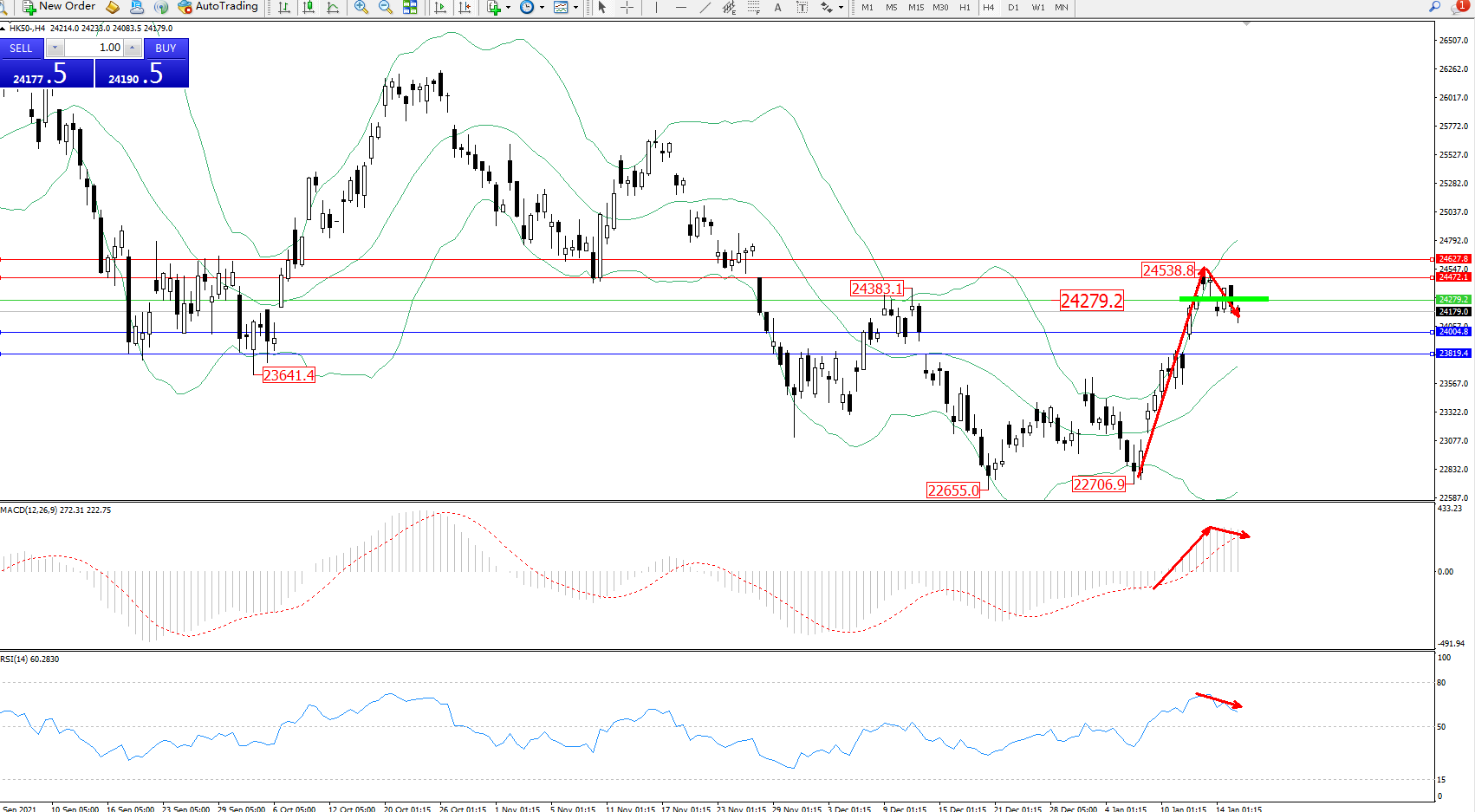 恒指HK50 ——4小时K线图显示: