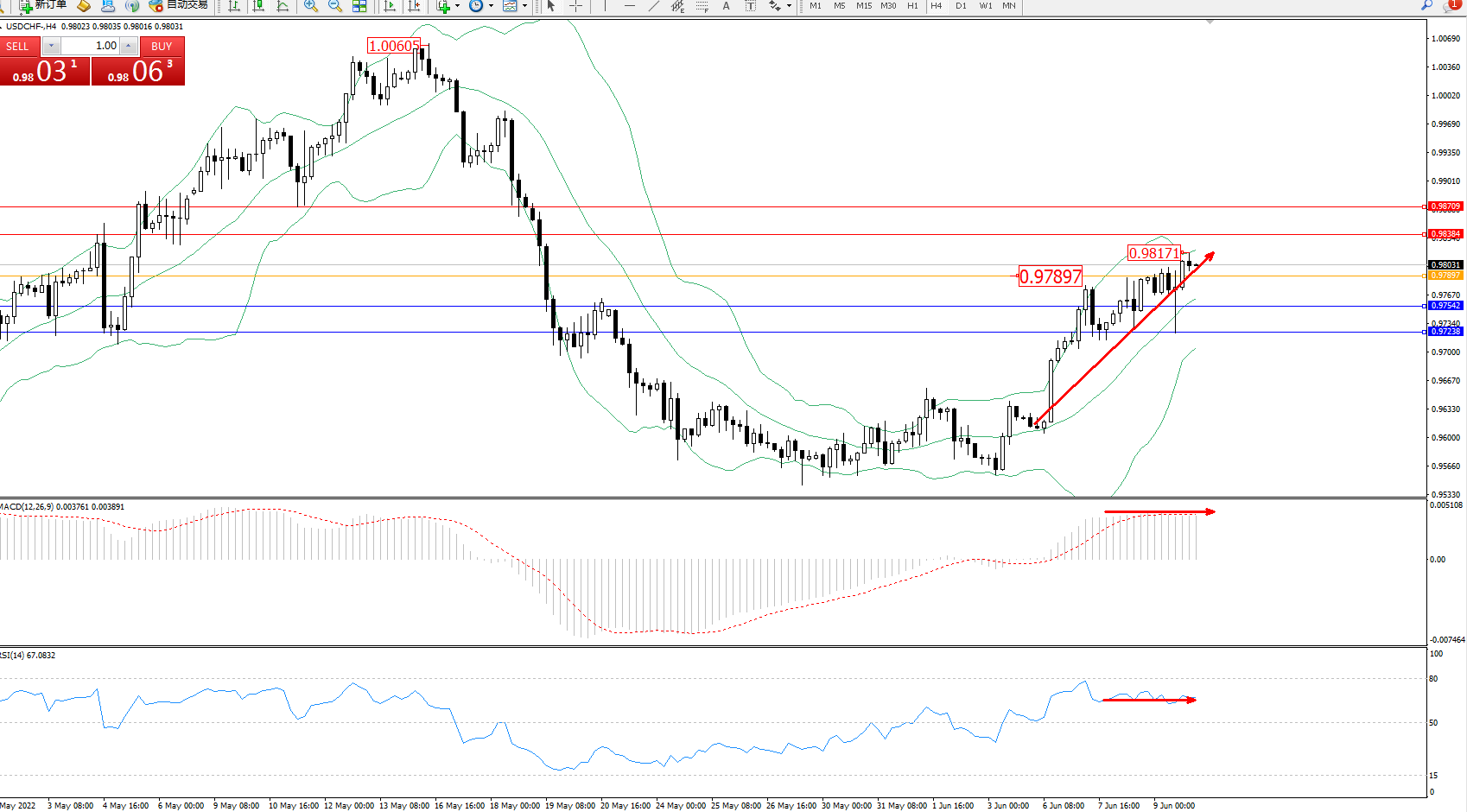 美元兑瑞郎维持0.98031附近震荡,国际组织相继对全球经济健康状况拉响警报。世界银行周二将其2022年经济增长预期下调近三分之一,并警告称滞胀风险上升,这为避险瑞郎提供了一些支撑。