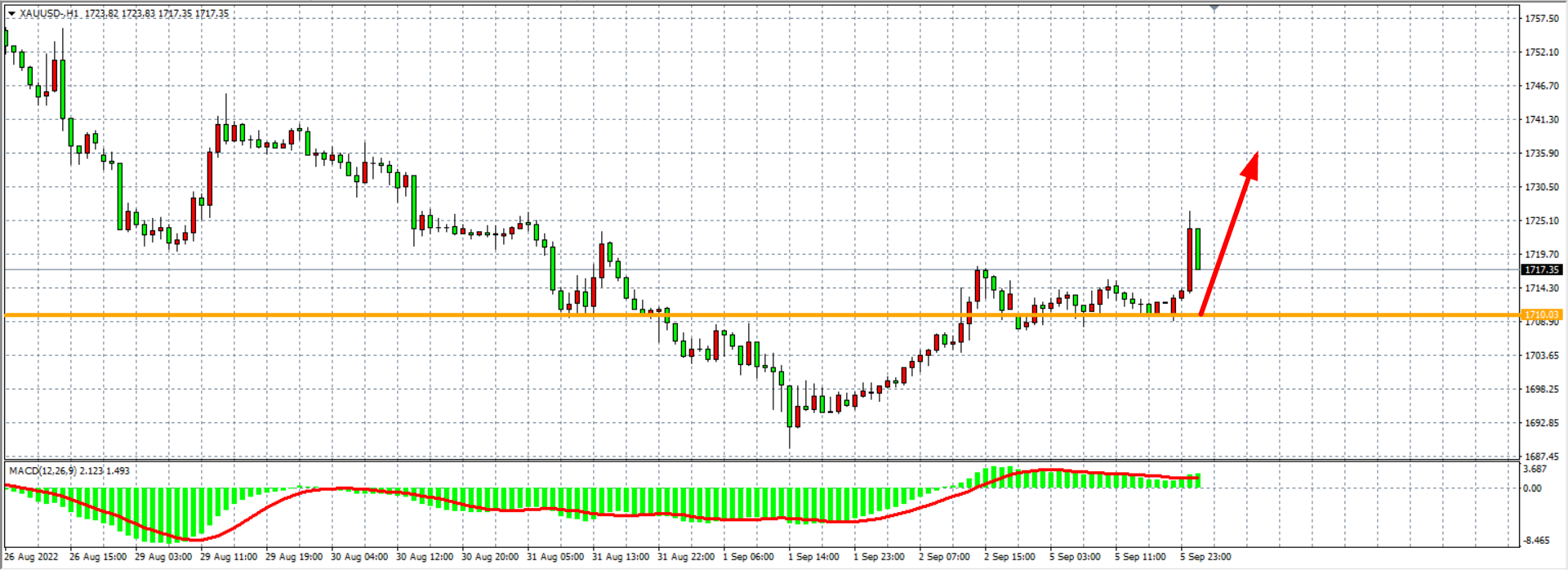 1小时图看,金价短线延续反弹势头,在1700美元之上重新走强,MACD于零轴之上持续放量,显示趋势由弱走强,支撑目前上移至1710美元,日内在1710之上继续看反弹1730-1750。